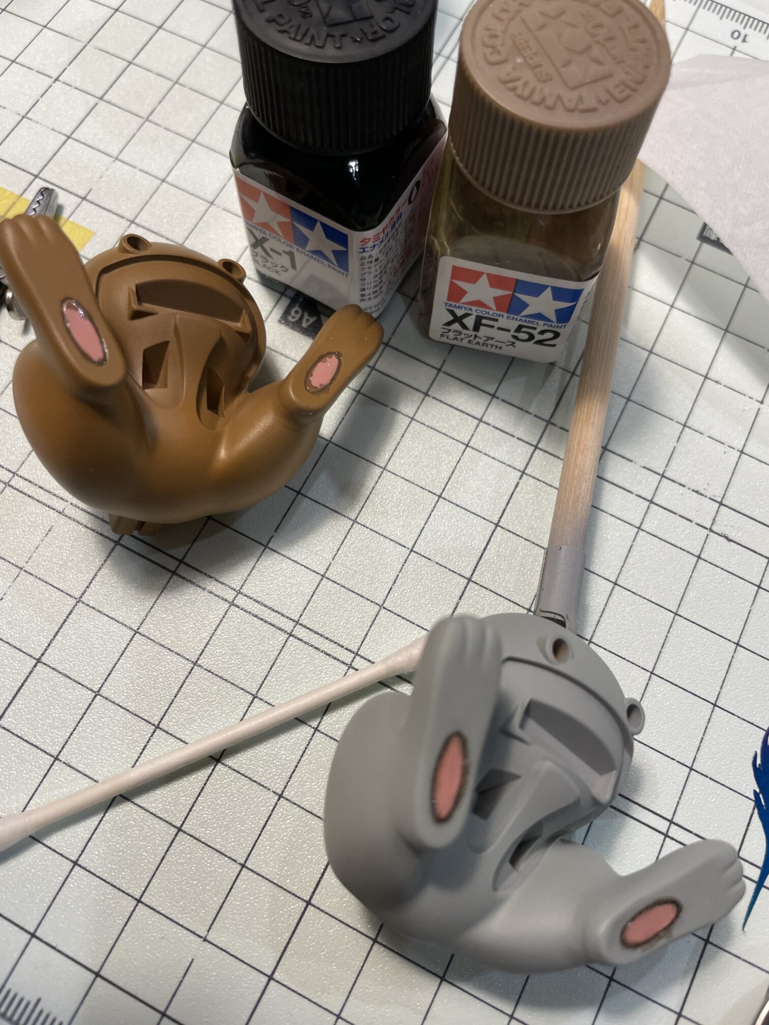 ⑩墨入れで眉、足の肉球周りを色入れ「タミヤエナメルカラーX-1:ブラック」「タミヤエナメルカラーXF-52:フラットアース」を1:2で塗装
